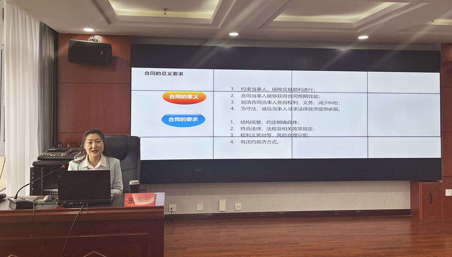 本次培训会议特邀集团公司常年法律顾问、河北德律律师事务所张冬梅律师就《民法典》合同编部分做了专题讲解,张冬梅律师围绕合同的意义、合同的基本结构、合同效力的规定、审查合同应注意的问题等内容做了精彩的授课,并对相关问题进行了解答。