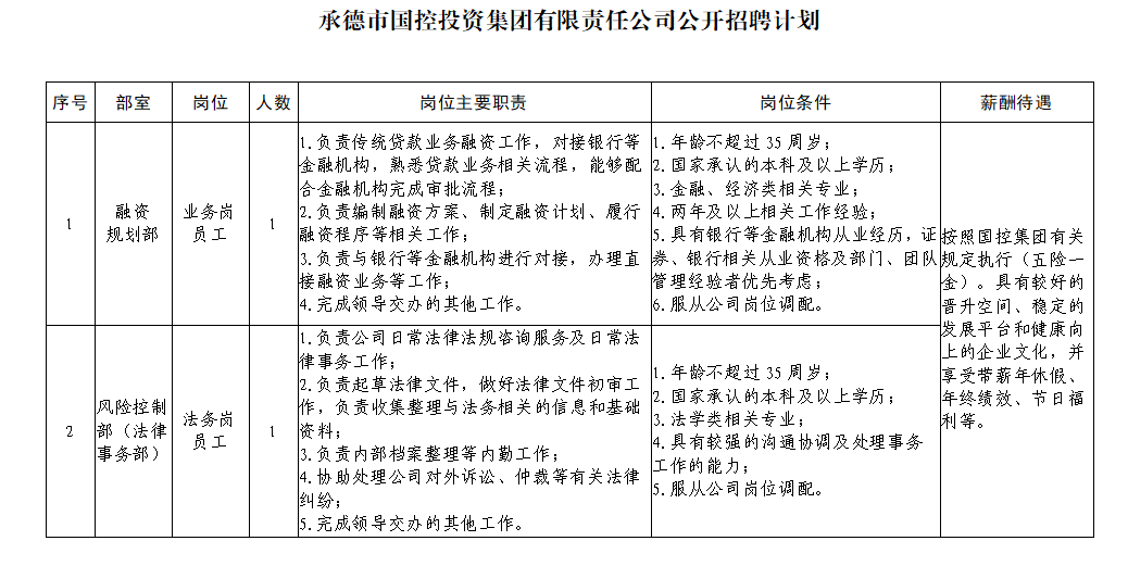 完美官方网页版(以下简称“完美官方网页版”)成立于2015年9月,是市委、市政府按照“市场化配置、集约化整合、企业化经营、资本化运作”的原则予以组建的国有独资企业。完美官方网页版隶属于承德市人民政府管理,注册资本3亿元人民币。现因完美官方网页版业务发展和工作需要,委托承德鸿雅伟业人力资源管理咨询有限公司(简称“鸿雅人资”)面向社会公开招聘工作人员,具体招聘信息公告如下: